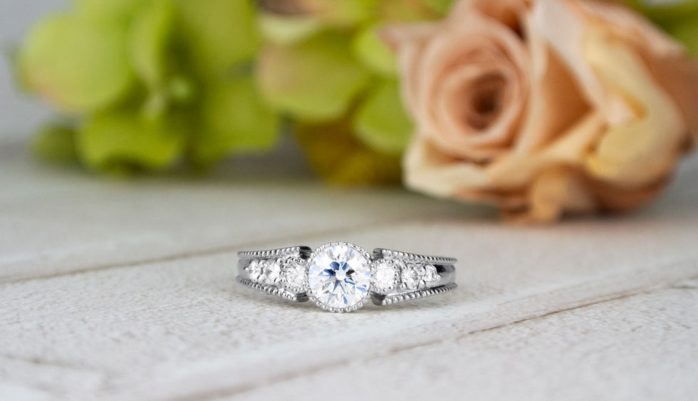 真ん中のダイヤモンドの両サイドに2石のメレダイヤを埋め込んだデザイン枠。ダイヤモンドの大きさと美しさが際立ちます。